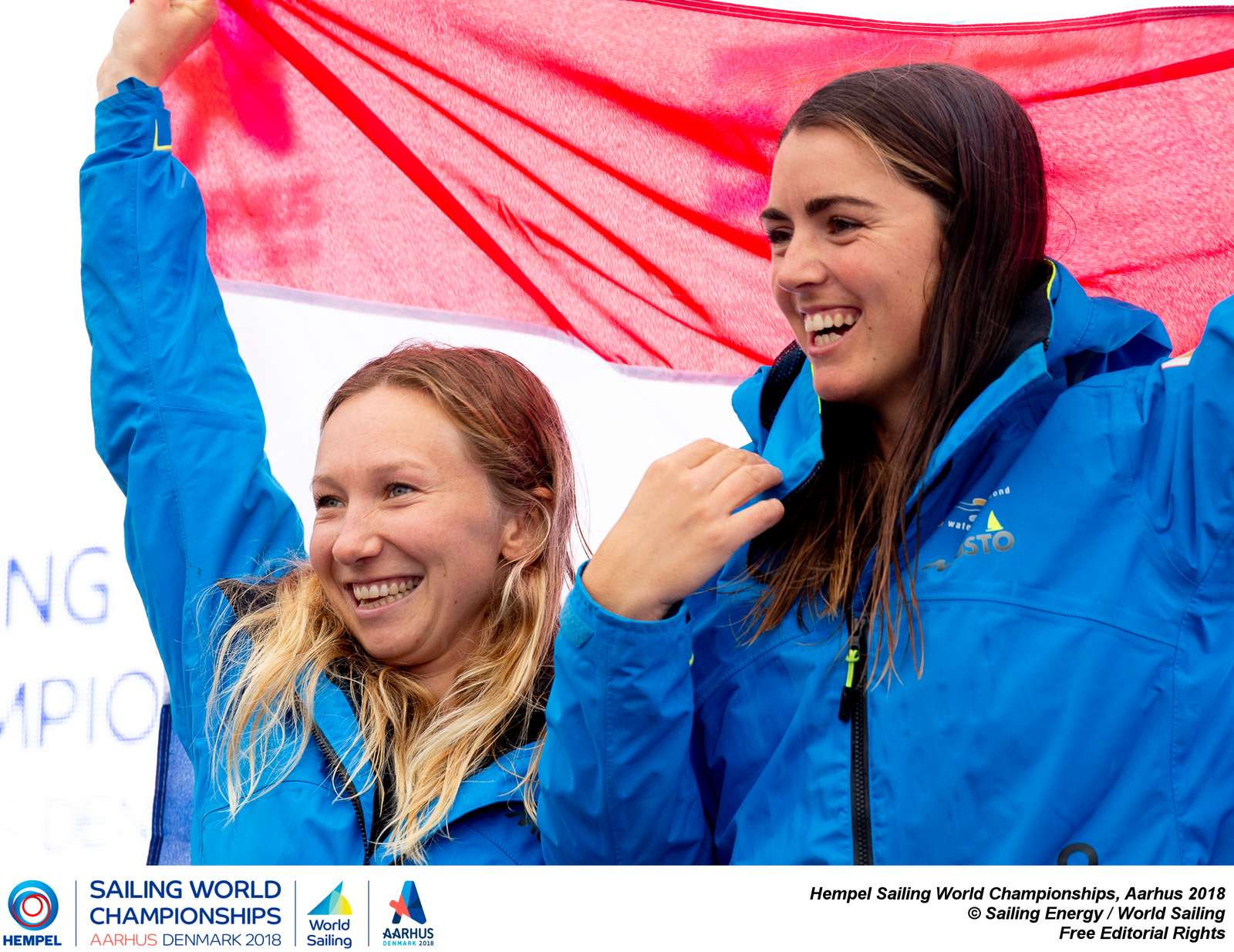 Annemiek Bekkering (left in the photo) became world champion in 2018. Together with Dorian van Rijsselberghe, she is this year’s tournament director of the Allianz World Sailing Championships. The former top athlete is currently manager of the Sailing Innovation Centre in The Hague.