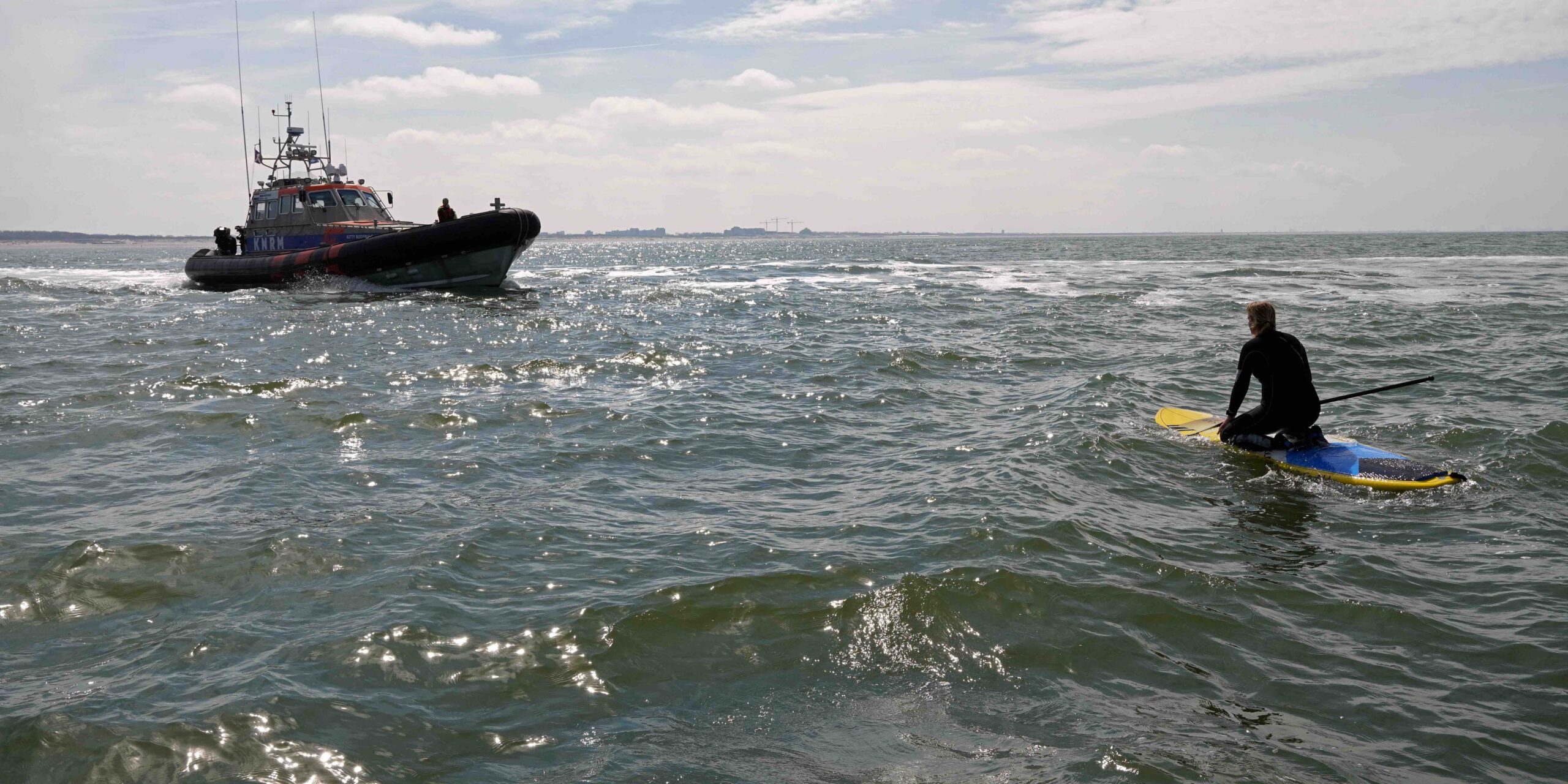 Geënsceneerde redding van een surfer op zee door de KNRM in samenwerking met SafeTrx. Het bedrijf heeft een horloge ontwikkelt waarmee reddingsdiensten surfers kunnen tracken en lokaliseren