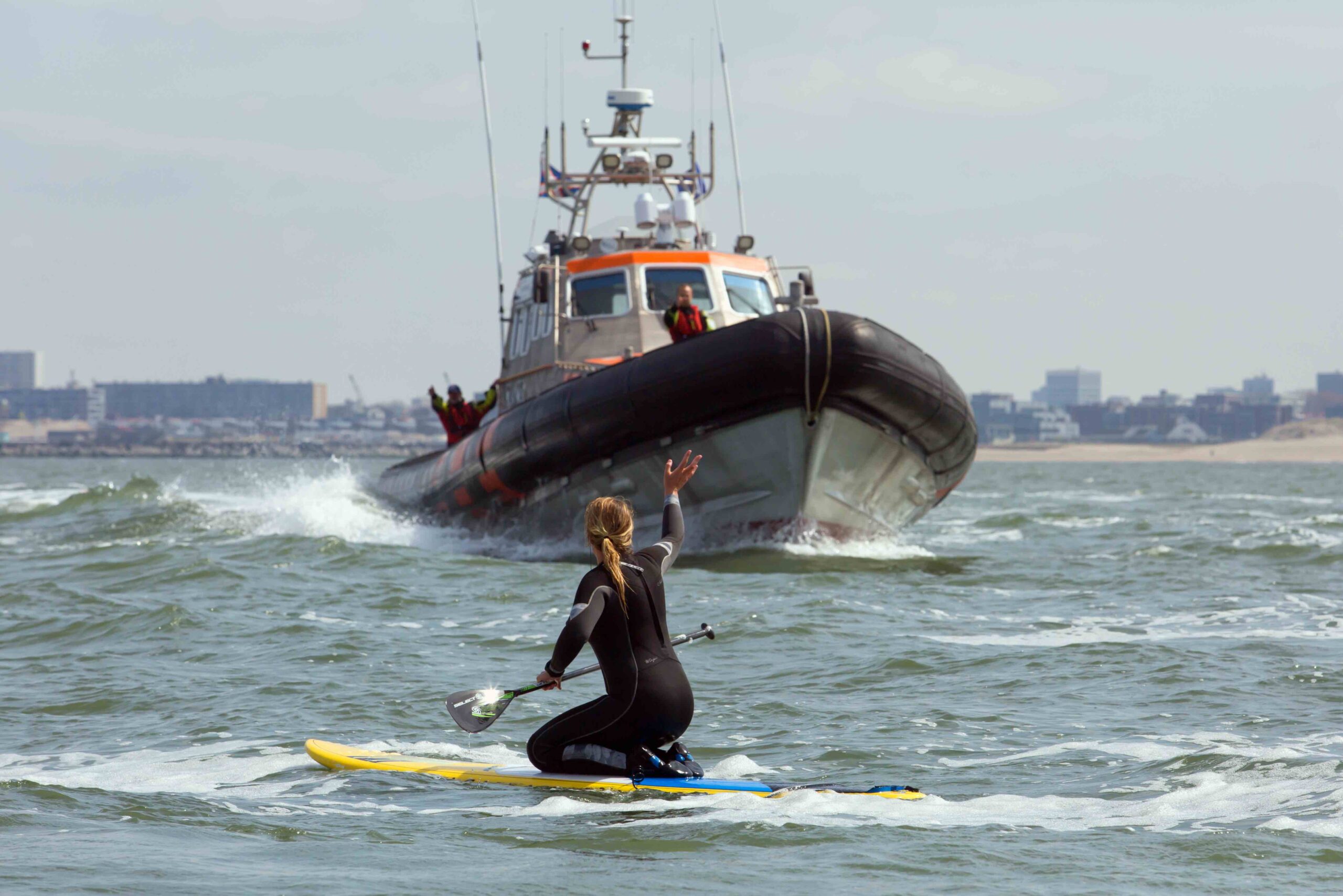 Geënsceneerde redding van een surfer op zee door de KNRM in samenwerking met SafeTrx. Het bedrijf heeft een horloge ontwikkelt waarmee reddingsdiensten surfers kunnen tracken en lokaliseren
